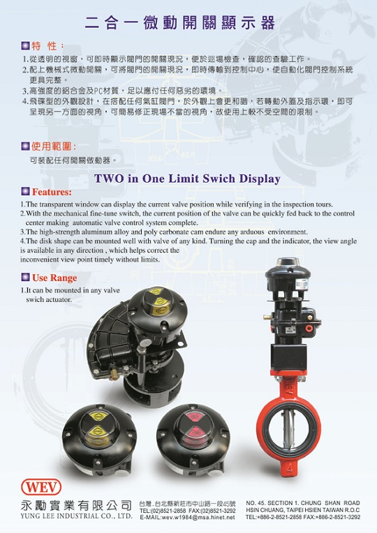 ● 從透明的視窗,可即時顯示閥門的開關現況,便於巡場檢查,確認的查驗工作 。 ● 配上機械式微動開關,可將閥門的開關線況,即時傳輸到控制中心, 使自動化閥門控制系